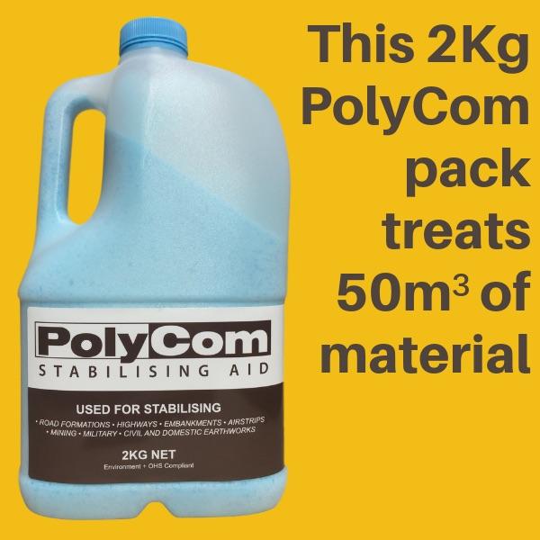 Road authorities procure PolyCom Stabilising Aid to upgrade road materials that would normally be deemed unsuitable for use. PolyCom is supplied in 2kg packs, a quantity that can stabilise 50m3 or 100 tonnes of road material - a stark comparison to traditional alternatives that would require significantly higher quantities of virgin material.