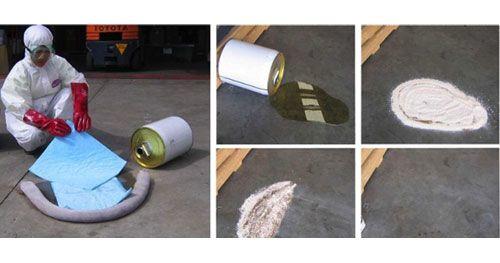 Initially, a spill kit is used to minimise the area effected by the spilled liquid. Minimising the effected area greatly assists with the spill clean up by: